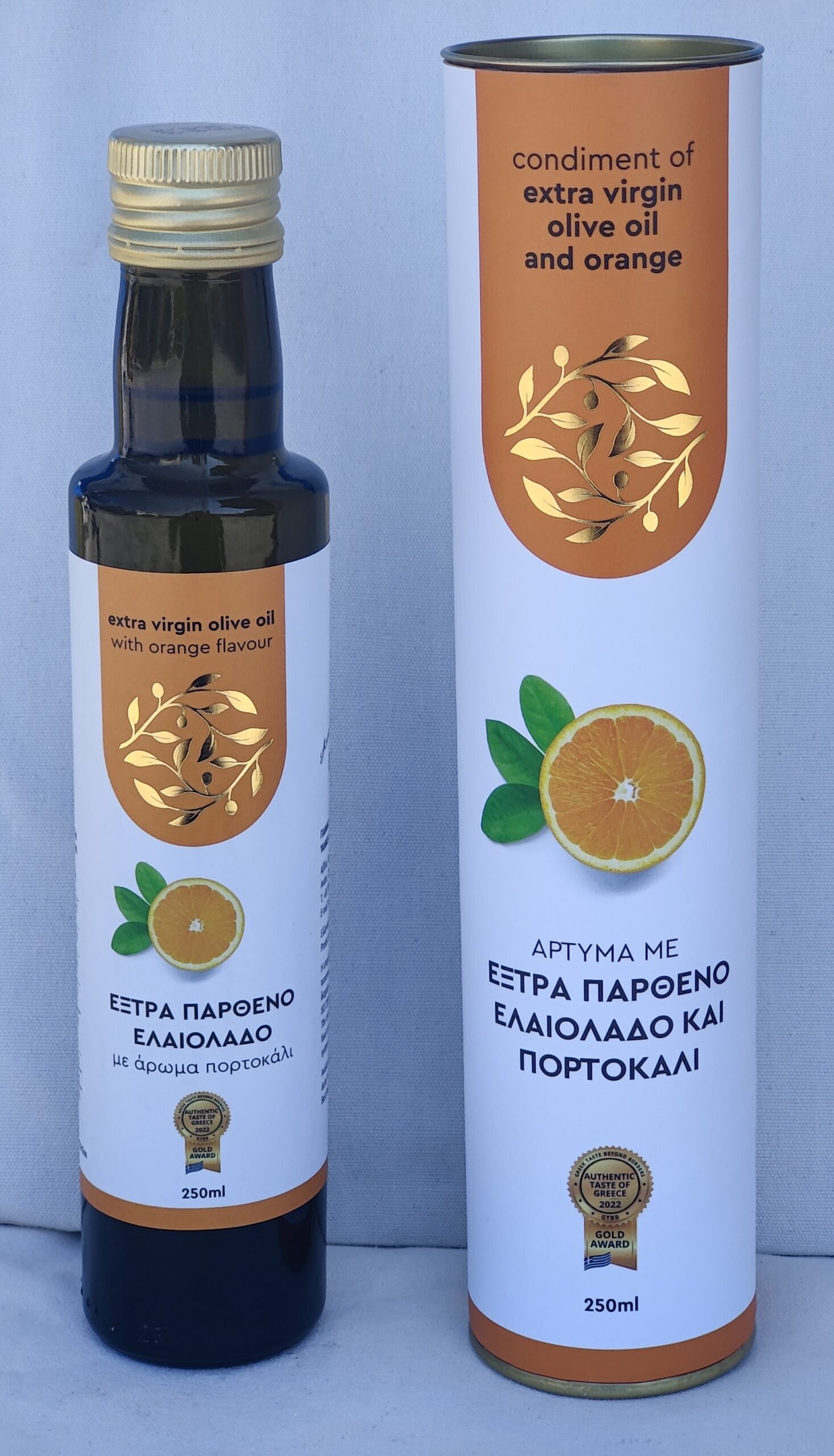 Découvrez notre huile d’olive aromatisée à l’orange. Vendu dans des bouteilles en verre de 250 ml.